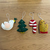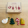 Elke set is helemaal compleet om 4 duurzame kersthangers te maken en bevat: vilt gemaakt van 100% gecertificeerde wol, vulling van 100% gecertificeerde wol, spelden, naald, wollen garens, draaddoorsteker, een beschrijving en een blad met patroondelen (gedrukt op duurzaam papier). Alle materialen zitten in een leuk hersluitbaar doosje.